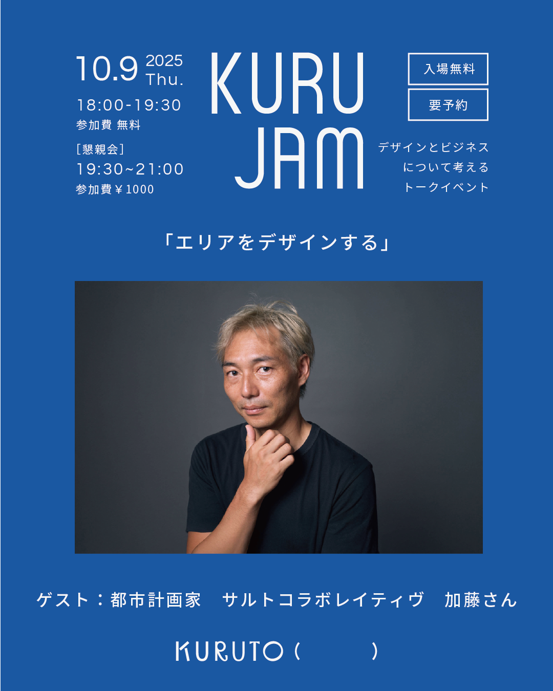 デザインとビジネスの領域を横断しながら活躍されている方をゲストとしてお招きし、現在の活動やその裏側にある考え、楽しさ、苦悩などを弊社CEO水谷と語っていただくトークイベント”KURU JAM“。