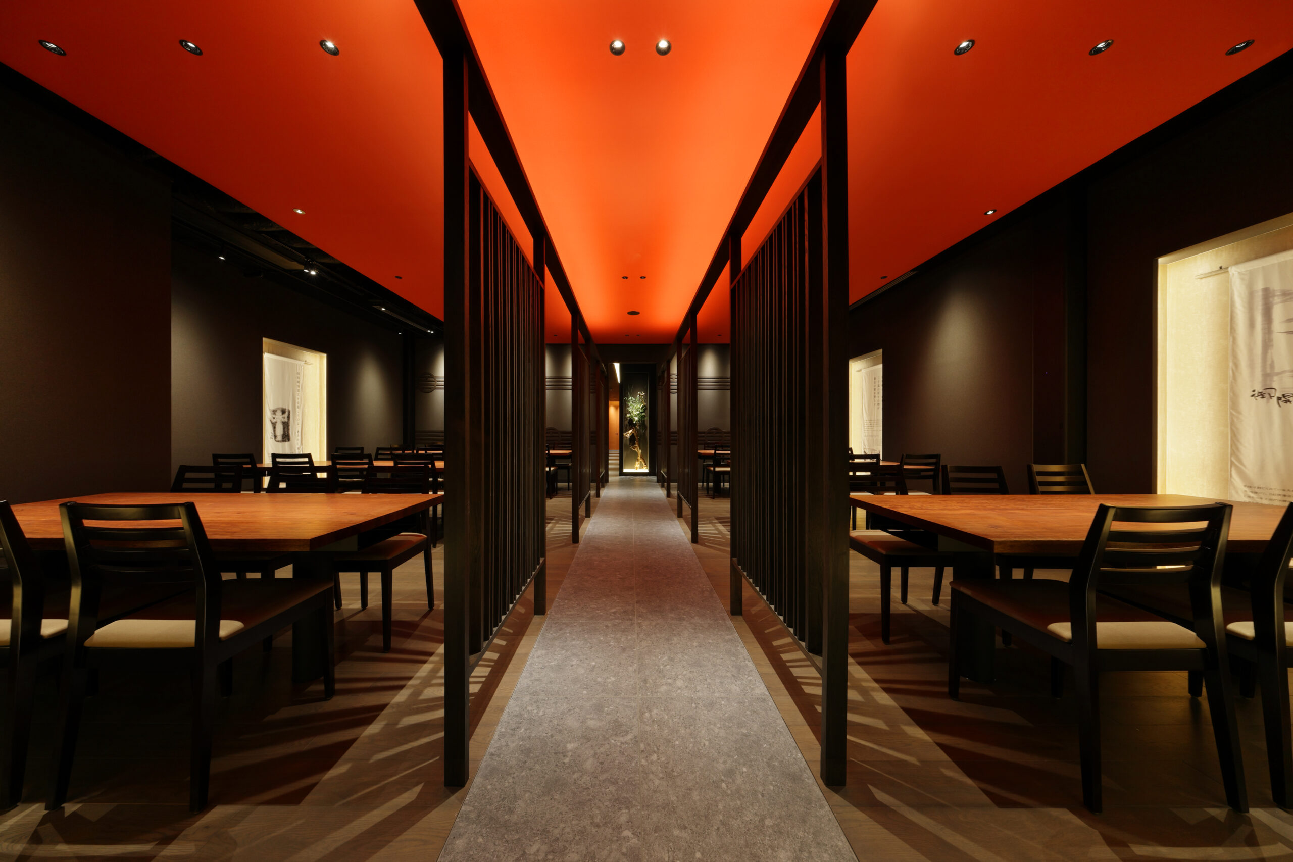 通路ー客席の間には間仕切り格子を配置し、他のテーブル席や往来の人の視線が遮られるよう工夫しました。吊り天井は赤で「肉」を表現しており、天井を際立たせるために壁は色味を抑えた黒にしています。
