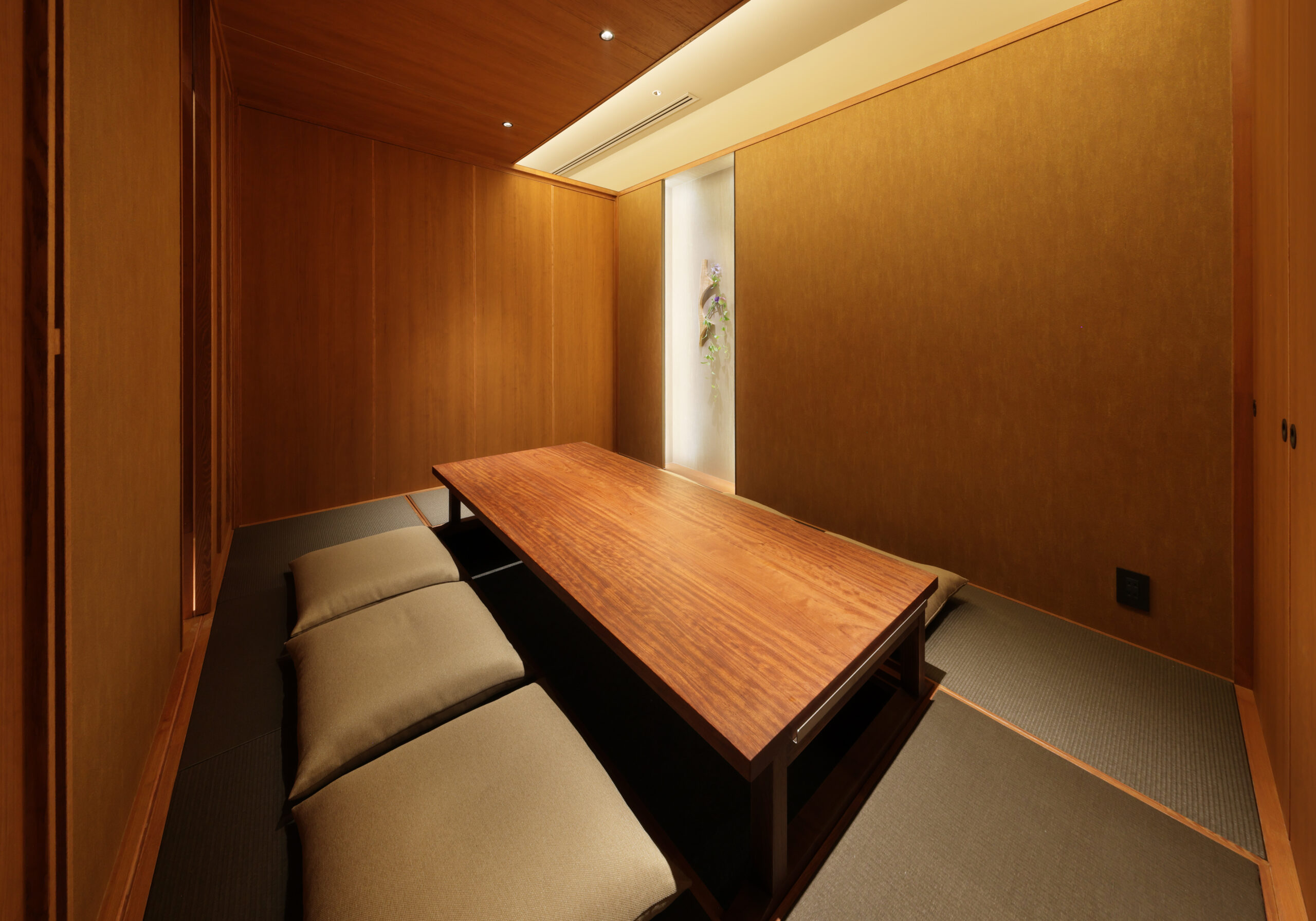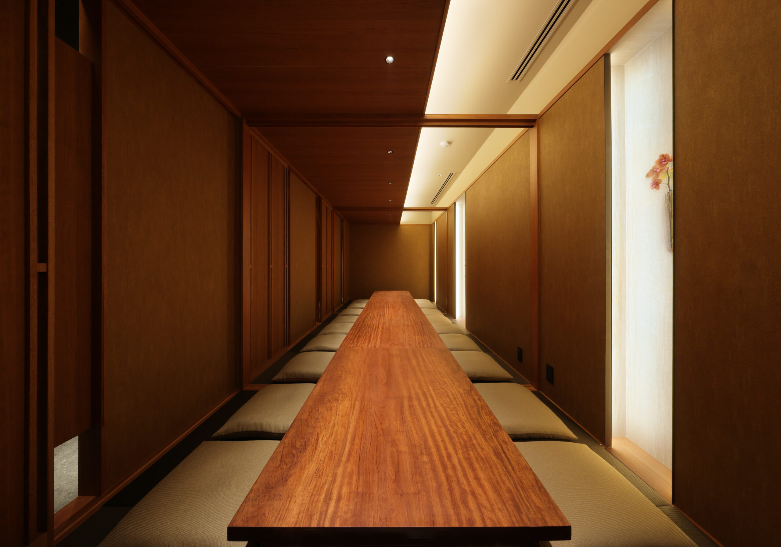 小上がり席の床は畳敷き、テーブルはブビンガを用いることで素材の温もりを感じさせる空間を目指しました。間仕切りを開け放ち、テーブル間にはめ板を設置することで大テーブルにすることも可能です。