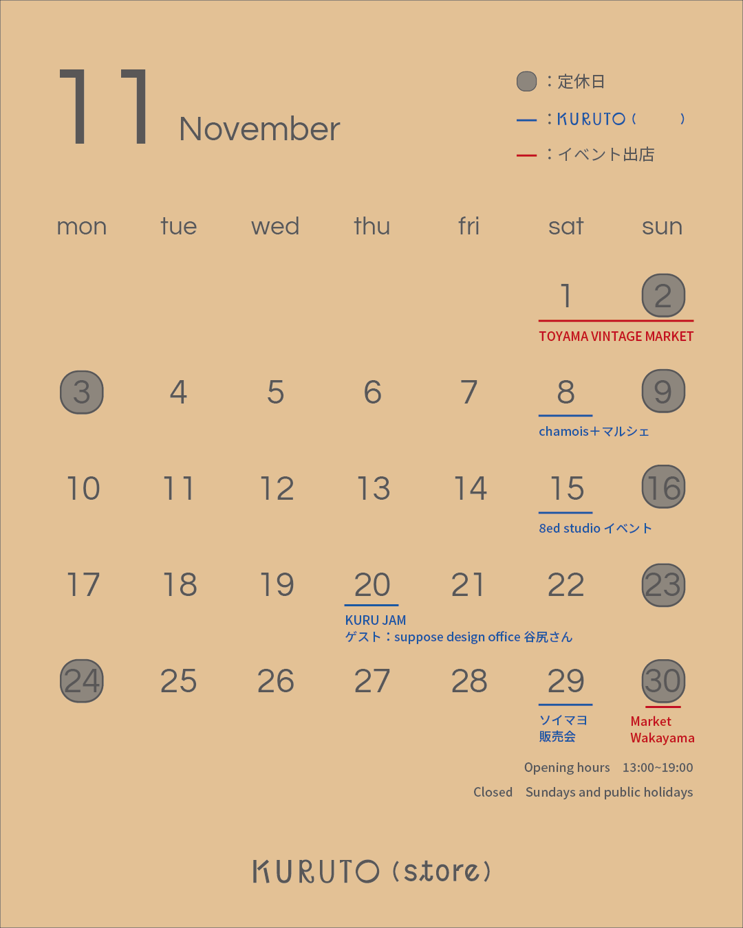 今月はKURUTOでのイベントに加え、大阪を飛び出し和歌山、富山でのイベントにも出店させていただきます。