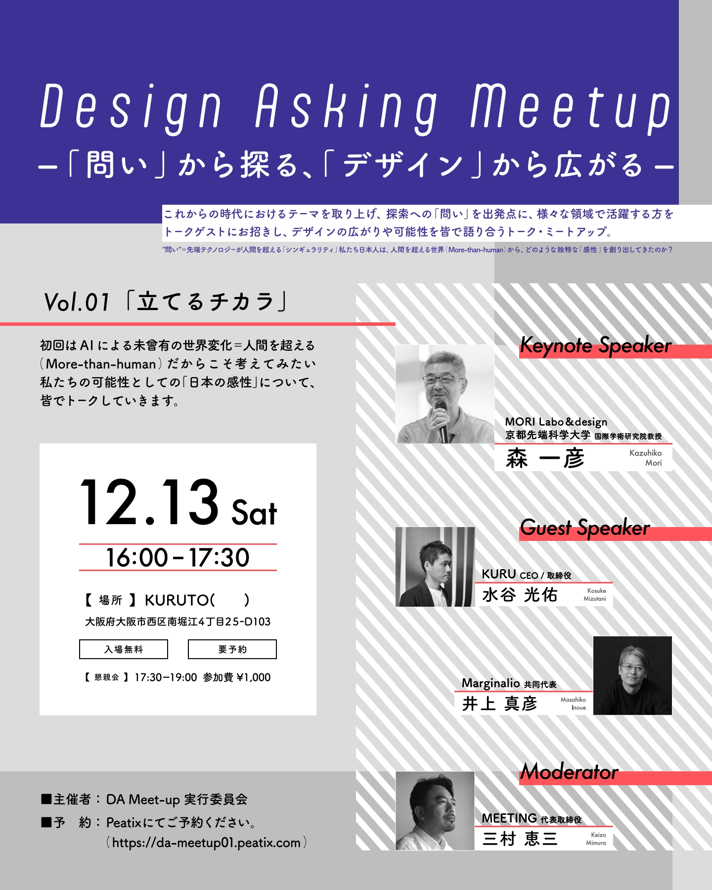 これからの時代におけるテーマを取り上げ、探索への「問い」を出発点に、様々な領域で活躍する方をトークゲストにお招きし、デザインの広がりや可能性を皆で語り合うトーク・ミートアップ。