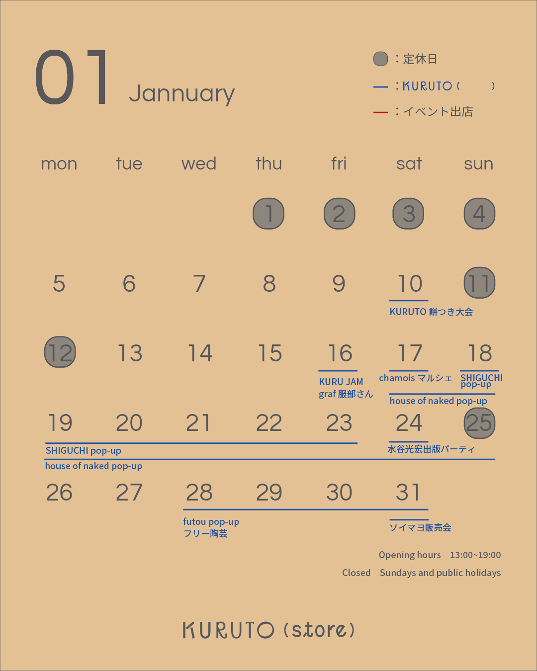 おもちつき、トークイベント、アパレルやうつわのポップアップ、陶芸体験、と年明けも楽しいイベントを企画しています。