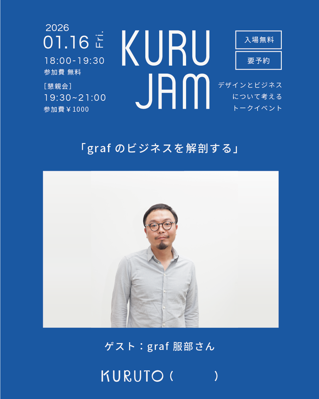 デザインとビジネスの領域を横断しながら活躍されている方をゲストとしてお招きし、現在の活動やその裏側にある考え、楽しさ、苦悩などを弊社CEO水谷と語っていただくトークイベント”KURU JAM“。