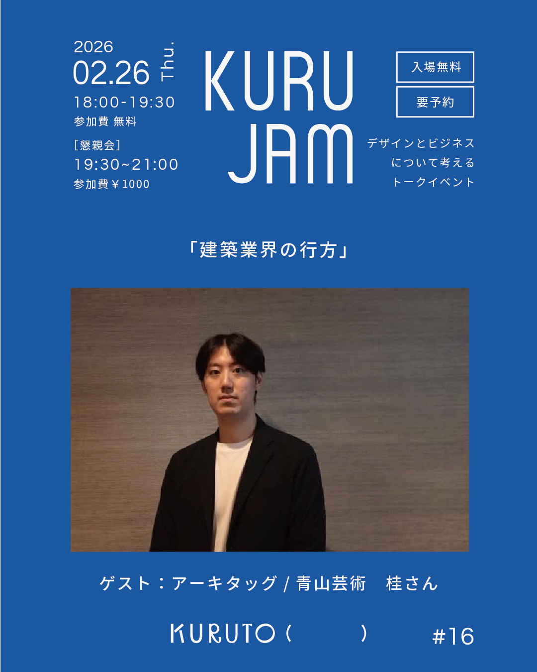 デザインとビジネスの領域を横断しながら活躍されている方をゲストとしてお招きし、現在の活動やその裏側にある考え、楽しさ、苦悩などを弊社CEO水谷と語っていただくトークイベント”KURU JAM“。