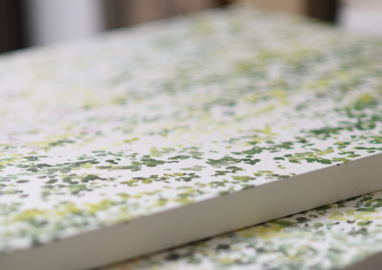 これをこう描こうと決めていることはあまりなくて、そのときの感覚で色を重ねていくことが多いです。たとえば“寒い感じ”を描こうと思って、寒い色をつくるじゃないですか。でもそれが、つらい寒さなのか、爽やかな寒さなのかで変わってくる。そのあたりを心と体に聞きながら描いていくというか。描いていくうちに、色が増えたり、季節が出てきたりすることもありますね。