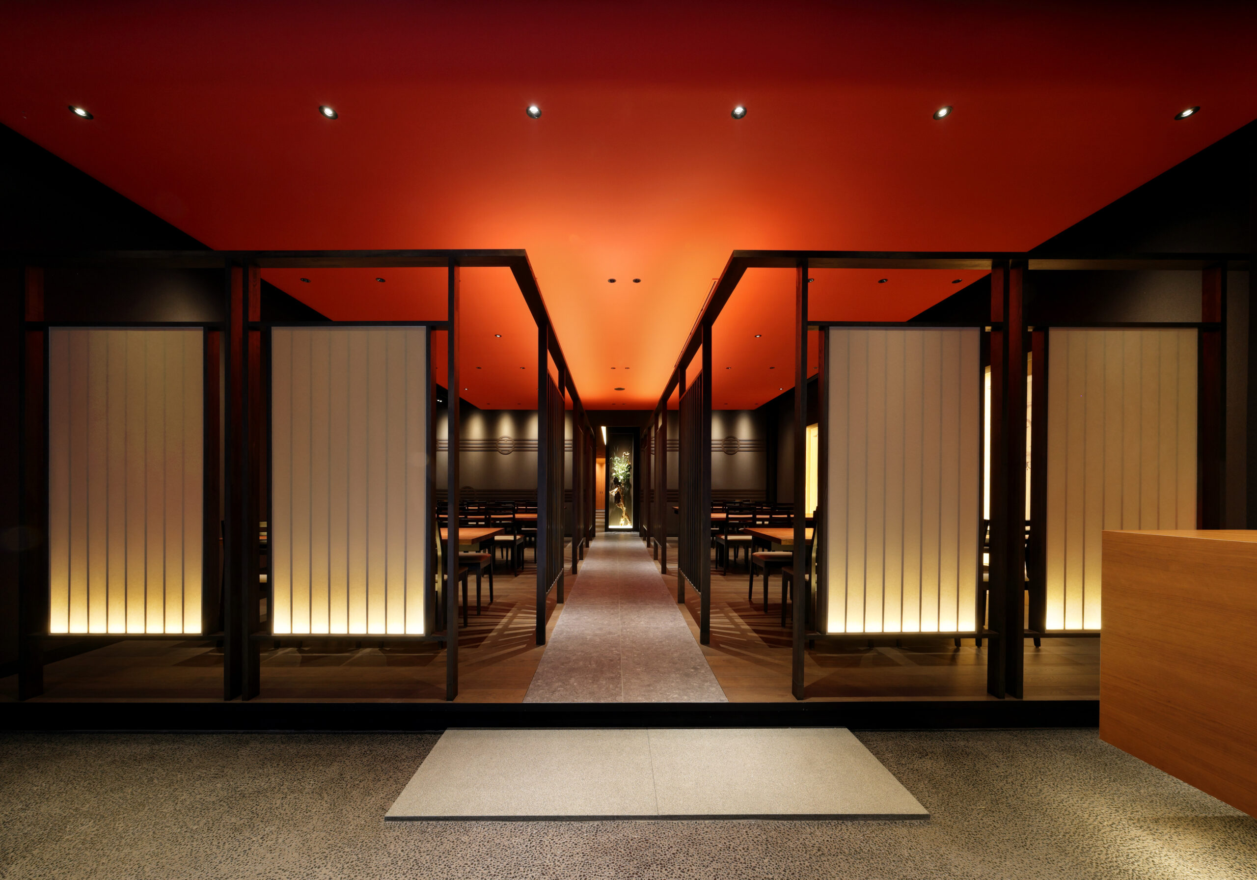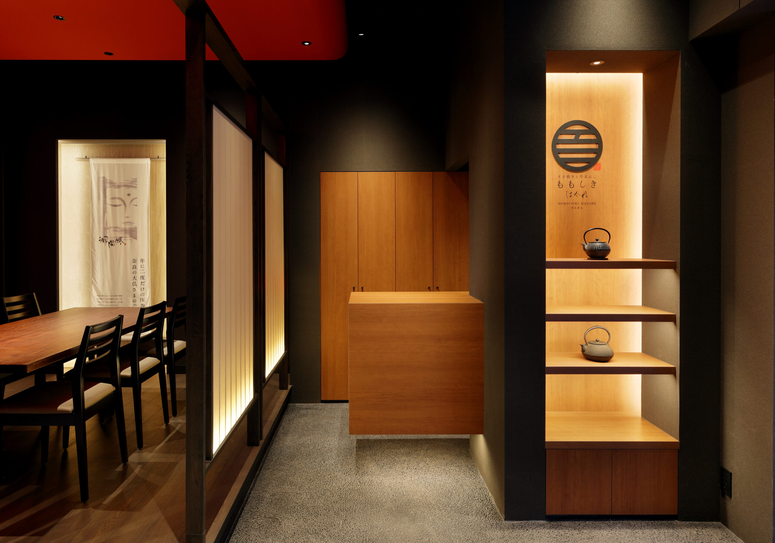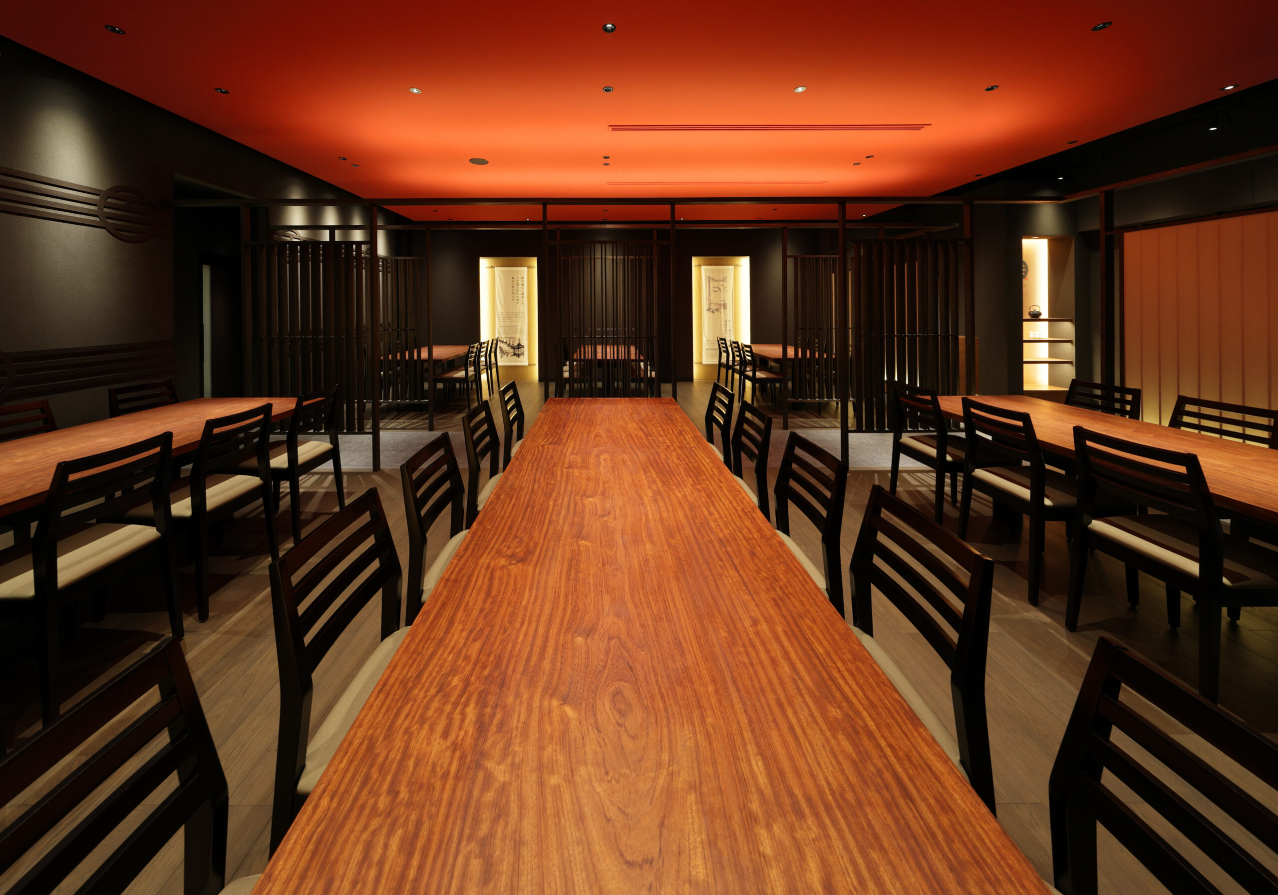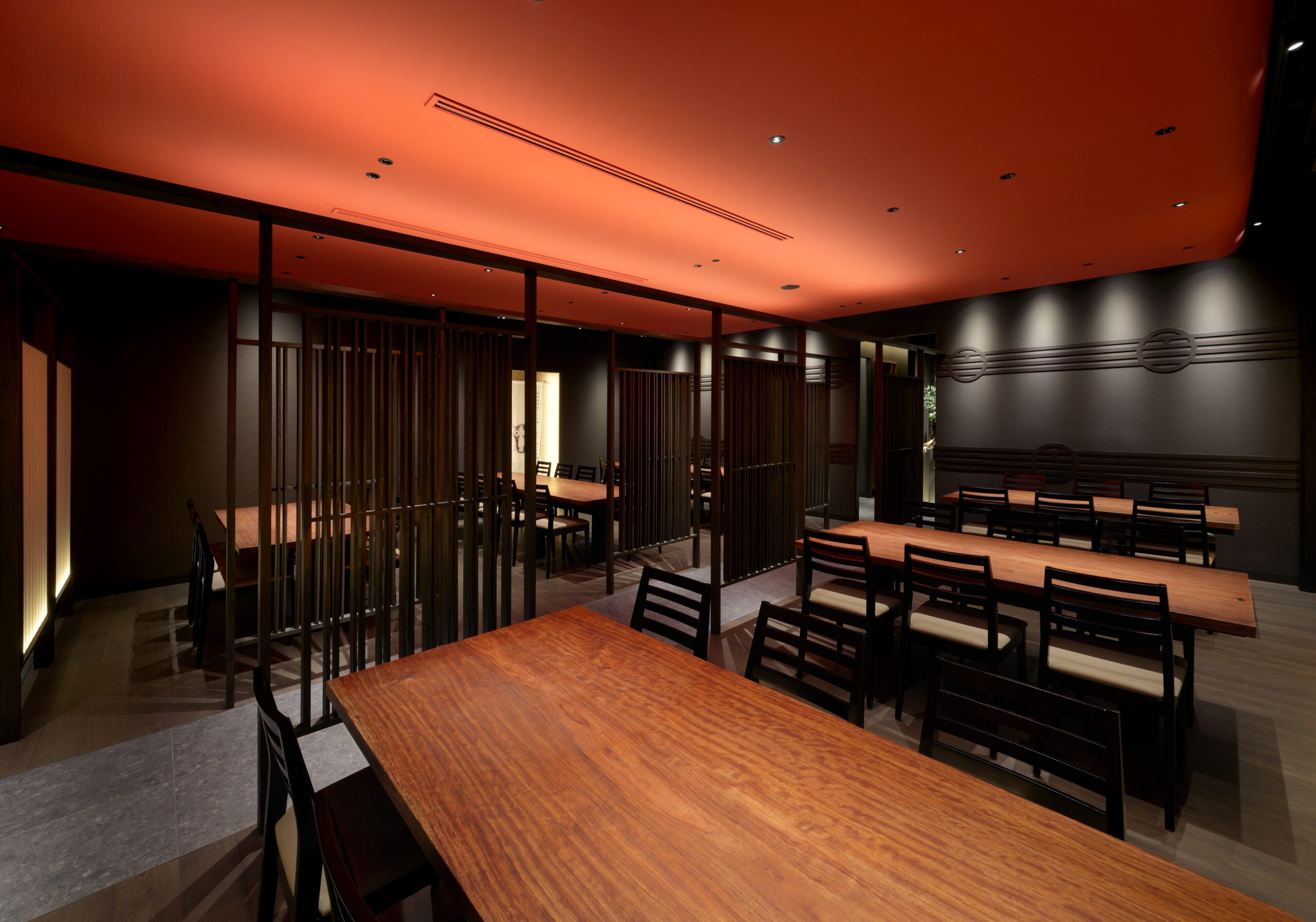 The interior of the restaurant has table seating in the front facing the street and raised seating in the back. The table seating has a bold suspended ceiling that evokes the red of meat, the floor is made of oak, and the tables are made of solid bubinga wood. Furthermore, the combination of vertical latticework and indirect lighting creates a calm, high-quality atmosphere.