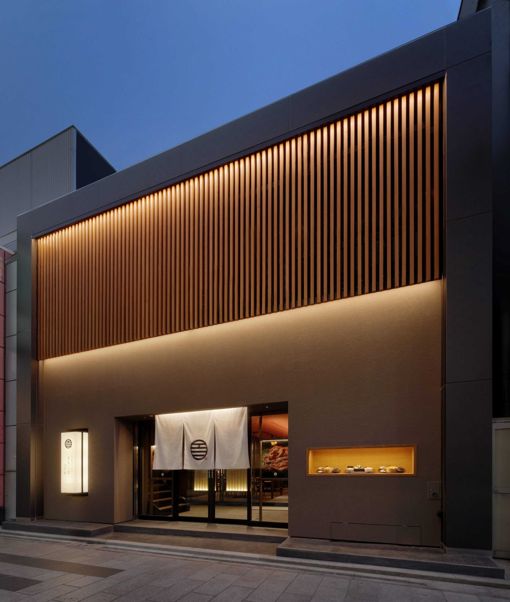 外観はジョリパットと木ルーバーを組み合わせ、色調を整えることで落ち着いた印象を演出。さらに、建物全体に間接照明や行燈照明を配し、強いインパクトを与えるとともに、視線を引き止める存在感を持たせた。暖簾やサンプルケースを設けることで、業態がひと目で伝わる外観デザインとしている。