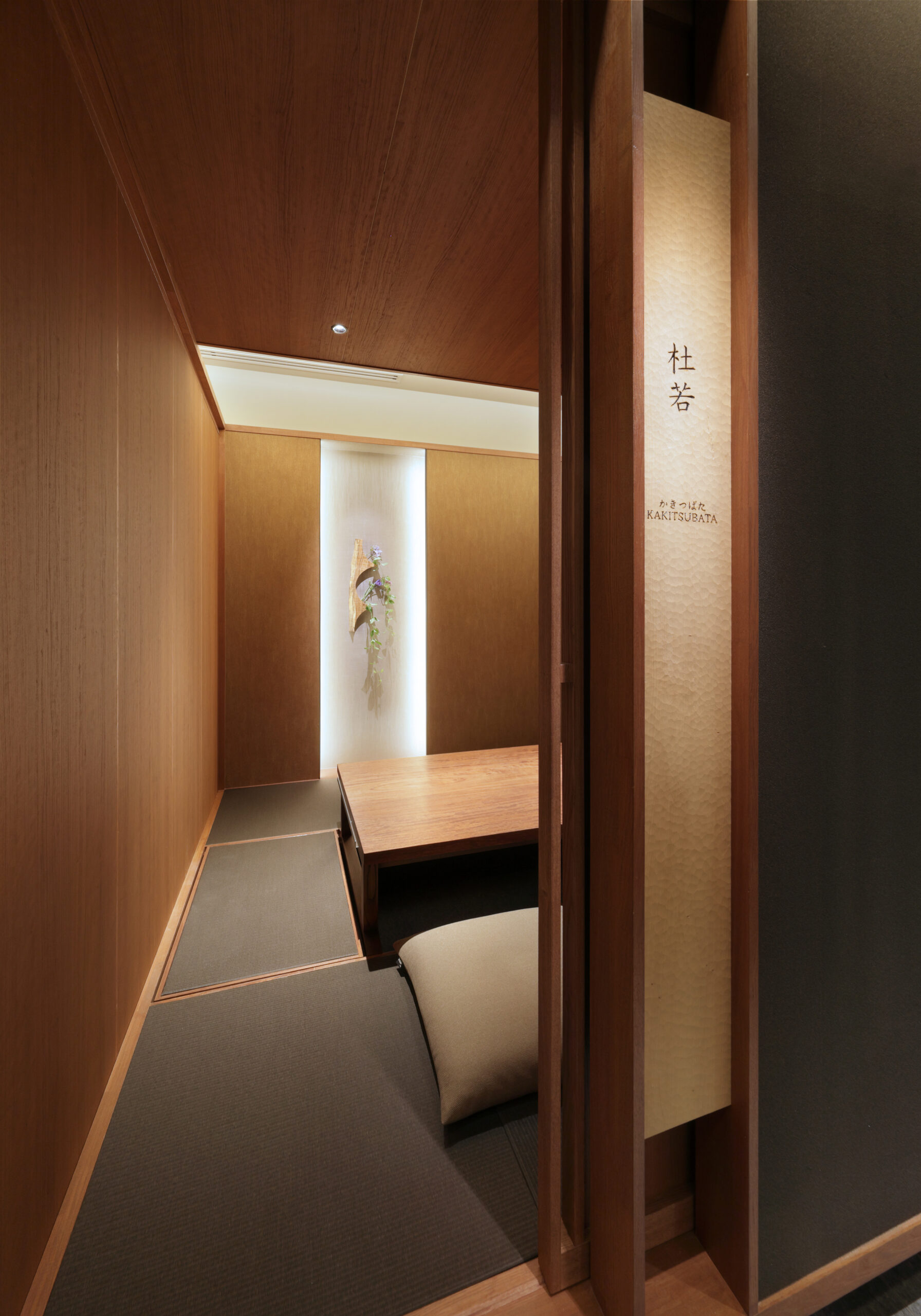 小上がり席は、多様な利用シーンに対応できるよう、取り外し式の建具による柔軟な空間構成とした。畳敷きの床にブビンガ材のテーブルを合わせ、素材の温もりを感じさせながら、間仕切り壁を開放することで大人数での会食にも対応できる。
