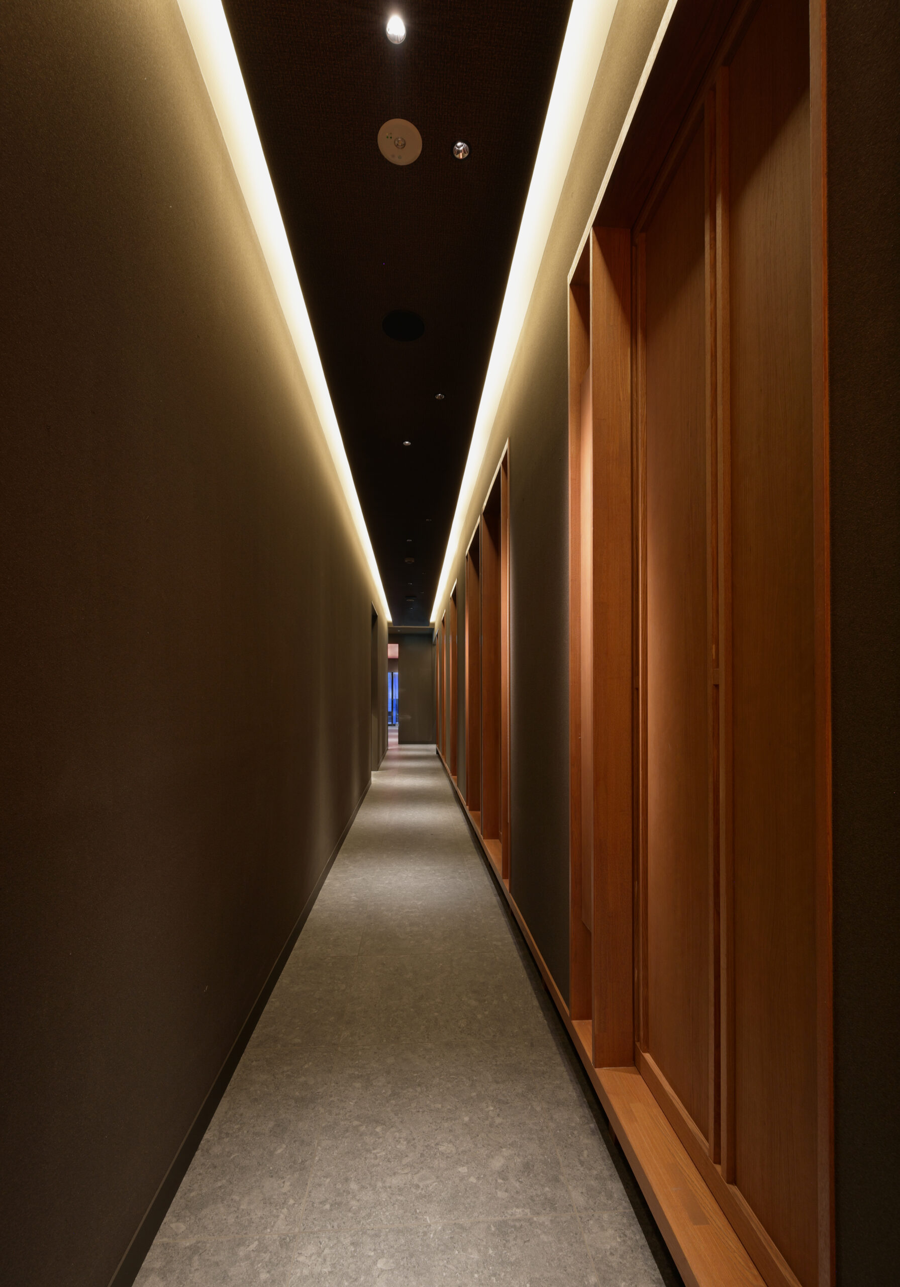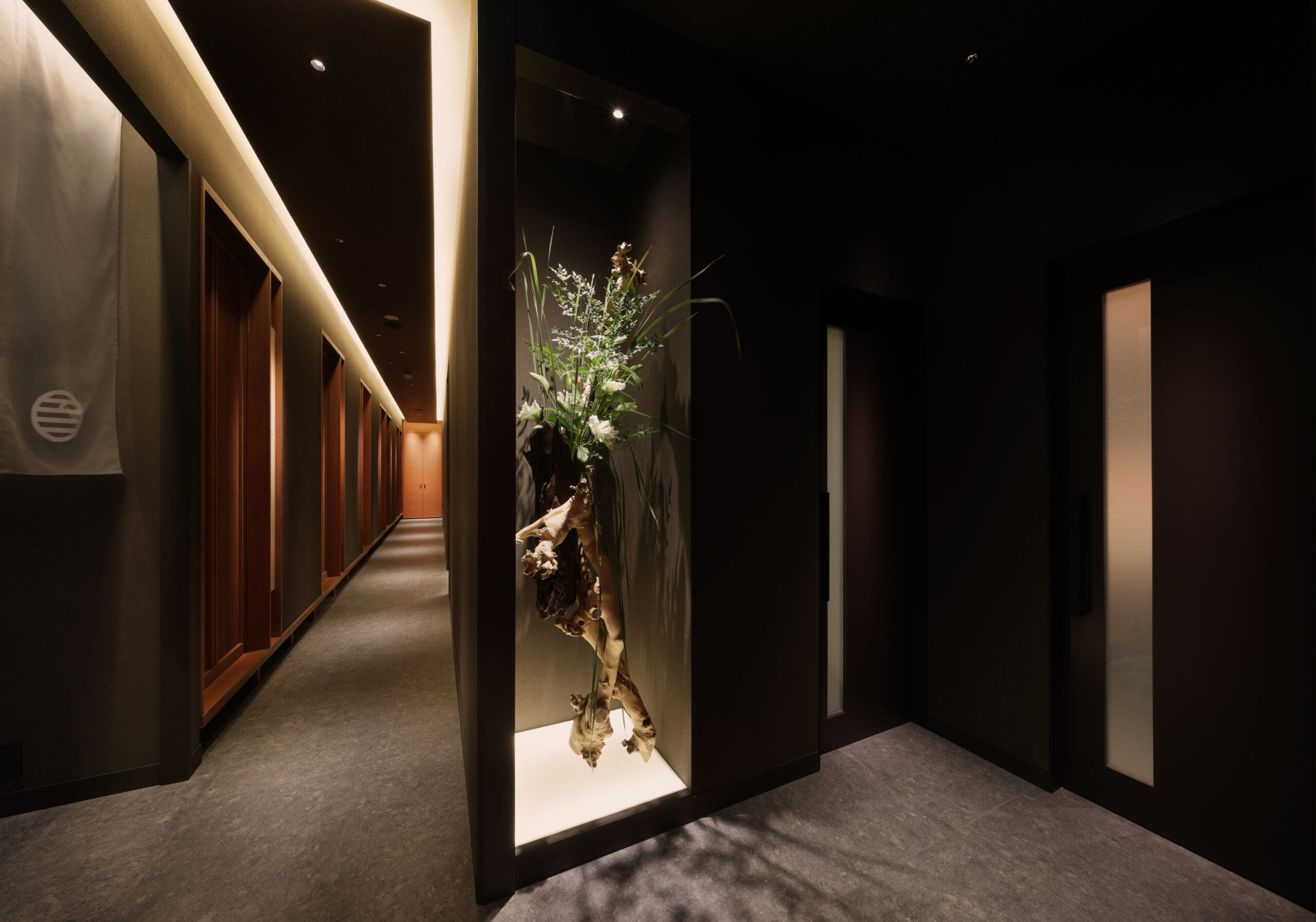 The exterior is made of a combination of Jolipat and wooden louvers, and the color tones are adjusted to create a calm impression. Furthermore, indirect lighting and lantern lighting are placed throughout the building, creating a strong impact and a presence that draws the eye. The installation of noren curtains and sample cases creates an exterior design that conveys the type of business at a glance.