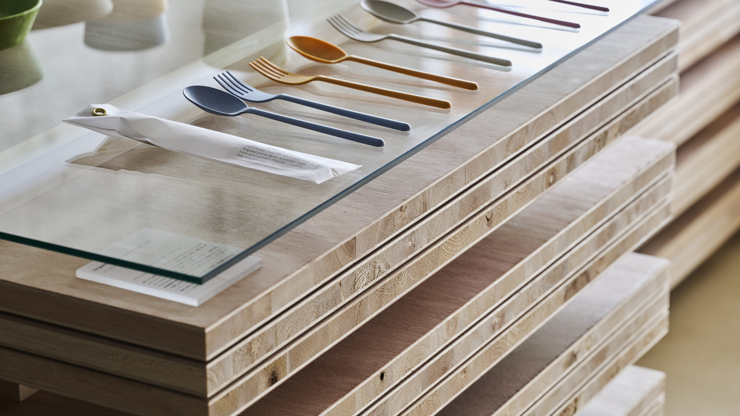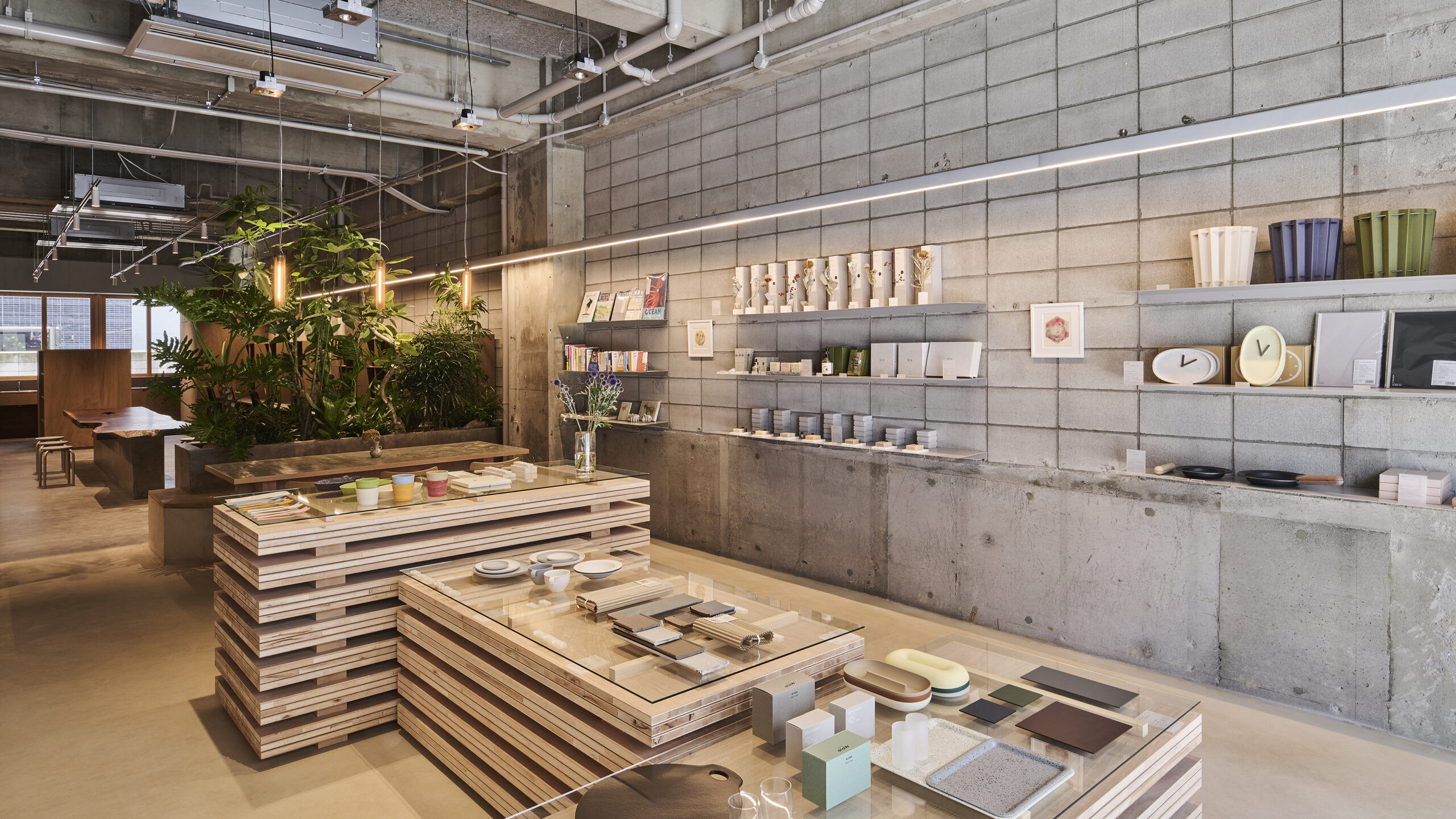 店舗とオフィスは賑わいを共有できるように同じ区画にまとめ、ギャラリーは単独の使用を想定して別区画にゾーニングした。街の歴史から着想を得た合板を積層させた什器や、既存躯体を引き立てる鉄板の陳列棚など、既存の空間から得た要素を場の用途と掛け合わせながら空間に散りばめることで、この空間の表情をつくりだしている。