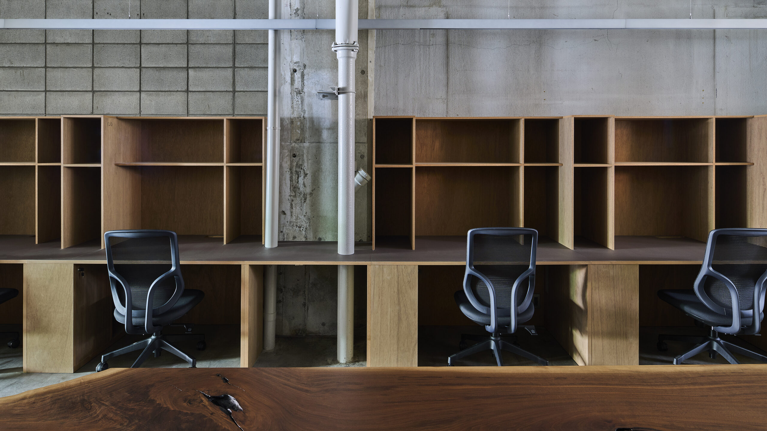 The retail and office areas share one unit to encourage interaction and activity, while the gallery occupies the other. Layered plywood fixtures inspired by the neighborhood’s history, and slender steel shelving that accentuates the raw concrete structure, are examples of how existing elements were re-edited and recombined with new uses to shape the character of the space.